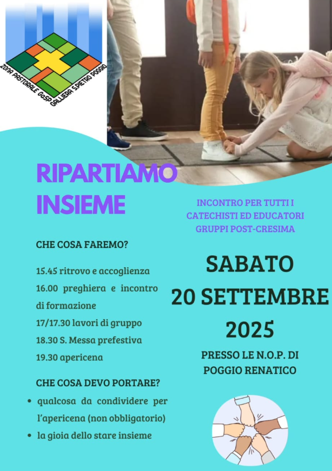 “Ripartiamo insieme” Sabato 20 Settembre ha avuto luogo il primo incontro dei catechisti ed educatori post-Cresima della nostra zona pastorale. Un bel momento di confronto, riflessione e formazione sul Vangelo, e conoscenza reciproca tra laici che hanno a cuore bambini e ragazzi di tutta la zona Pastorale. Desideriamo ringraziare educatori e catechisti per il loro lavoro, tempo, attenzione e cura affinché i più … Continue reading Ripartiamo Insieme