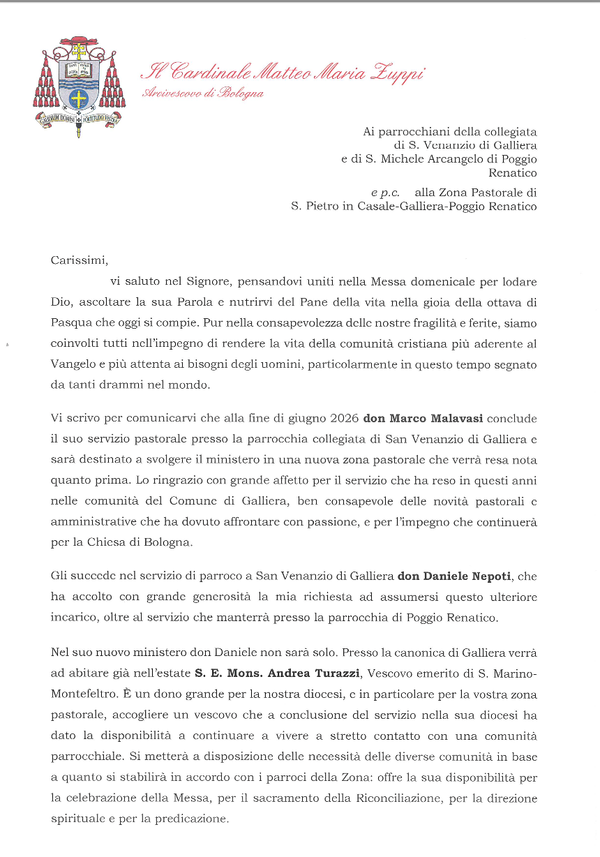 Galliera, Poggio Renatico, Zona Pastorale 12 Aprile 2026 Rivolta in particolare alla Parrocchia Collegiata di San Venanzio di Galliera e alla Parrocchia di Poggio Renatico Lettera del Cardinale Arcivescovo – Aprile 2026 Lettera Galliera - Poggio Renatico