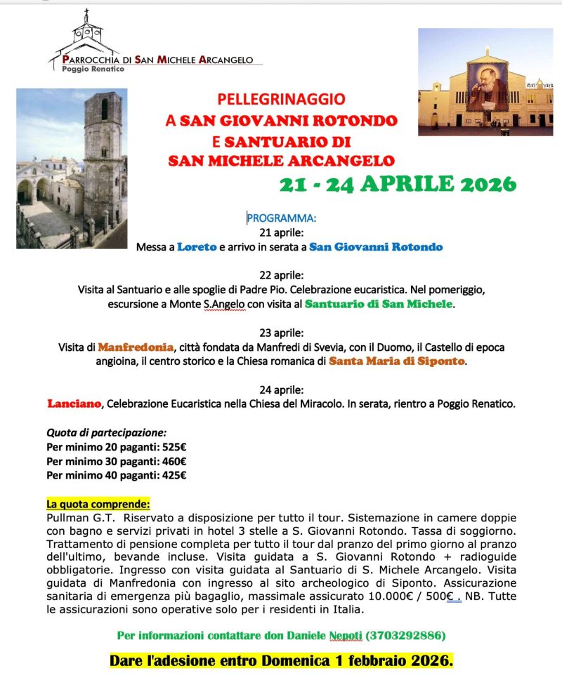 Zona Pastorale 5 Gennaio 2026 Dal 21 al 24 aprile 2026 Pellegrinaggio a San Giovanni Rotondo Parrocchia di San Michele Arcangelo di Poggio Renatico Iscrizioni entro il 1°febbraio 2026