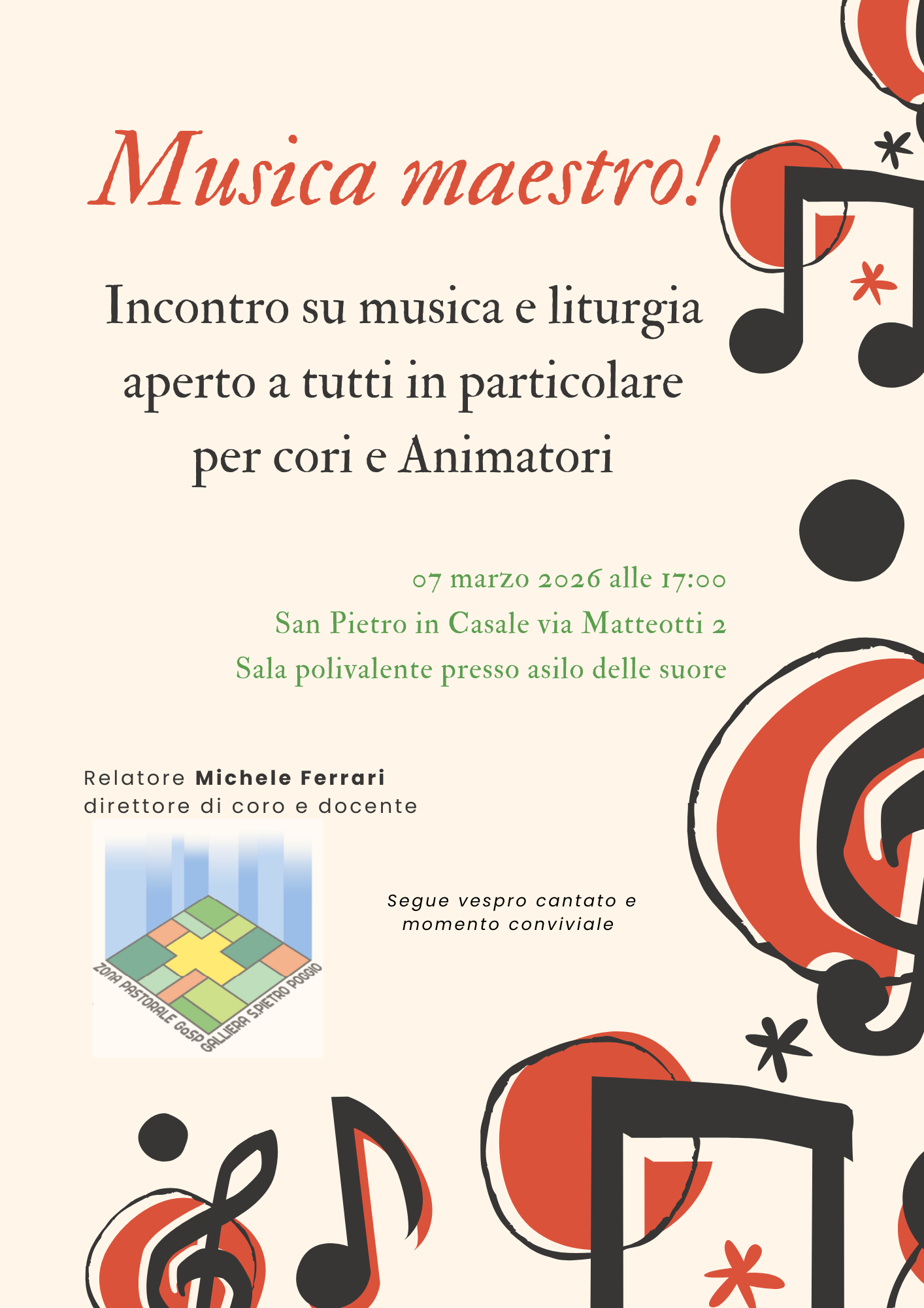 Liturgia, Zona Pastorale 23 Febbraio 2026 Musica Maestro! sabato 7 Marzo Descrizione: Incontro aperto a tutti, in particolare a cori e agli animatori. Inizio: 07/03/2026 17:00 Fine: 07/03/2026 19:00 Categorie: Liturgia, Zona Pastorale Allegati: Volantino_5